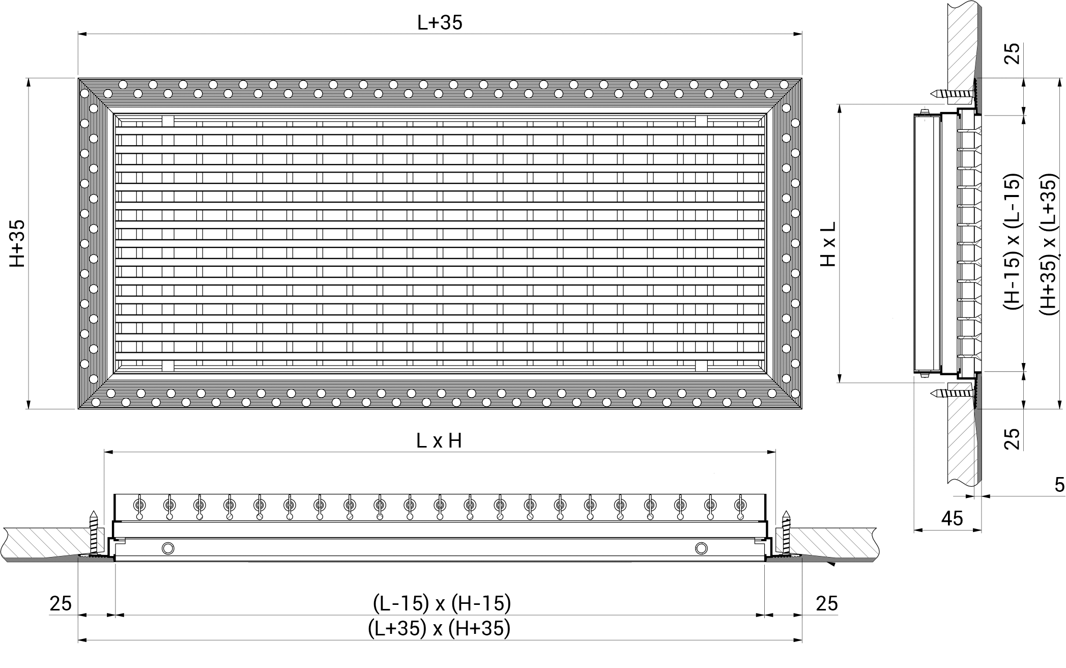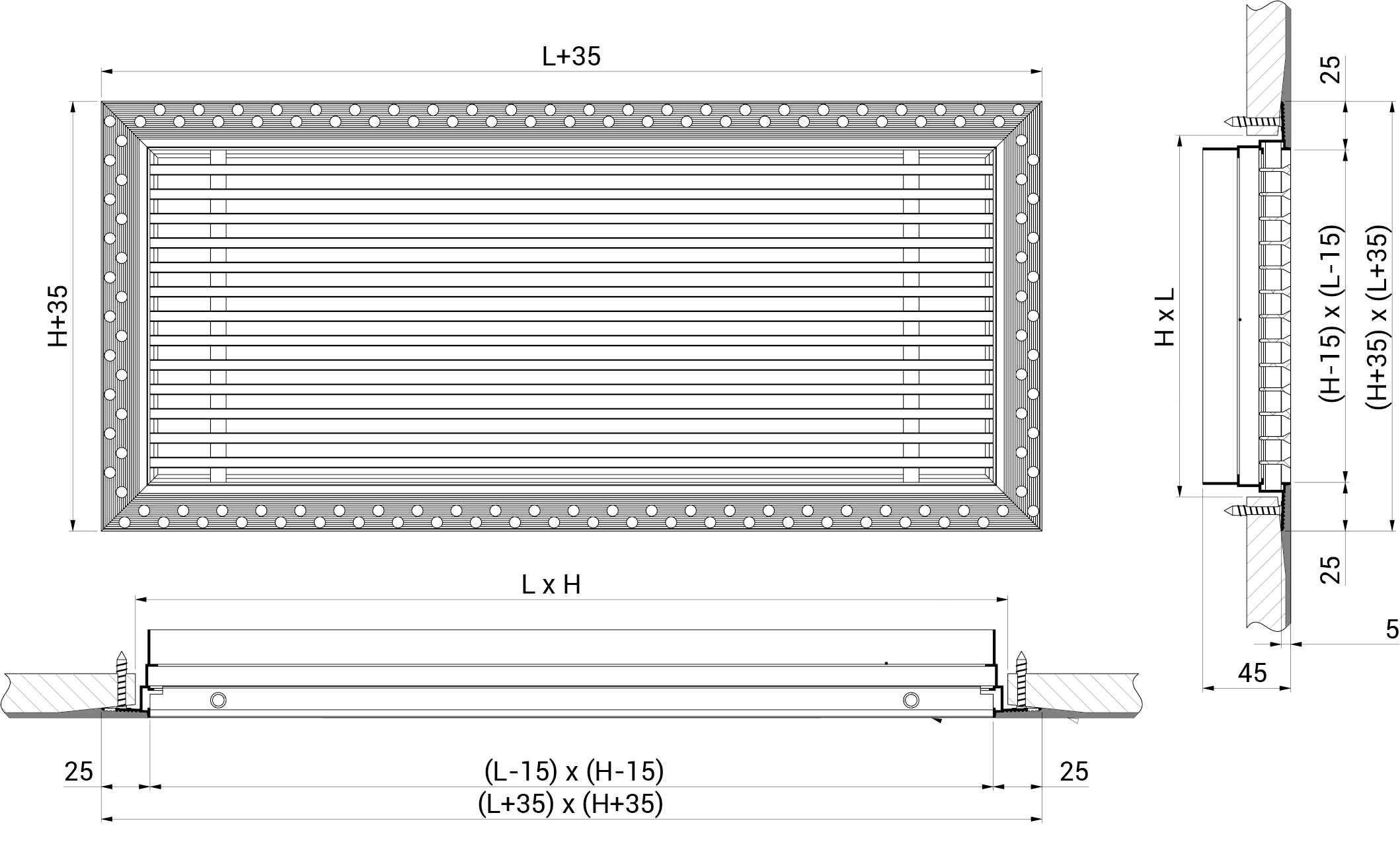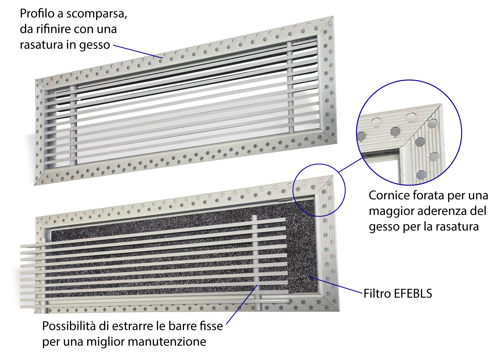 EBLS Bocchette lineari a barre orizzontali fisse con corpo centrale removibile e cornice a scomparsa.