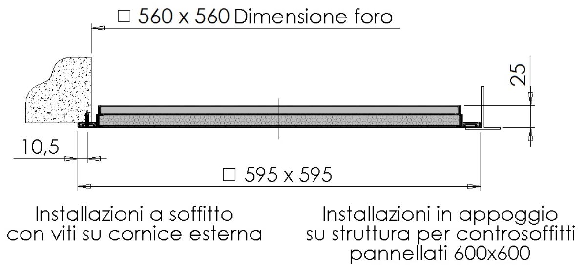 Telaio perimetrale in alluminio. Pannello in acciaio zincato. Verniciatura colore bianco RAL 9016.