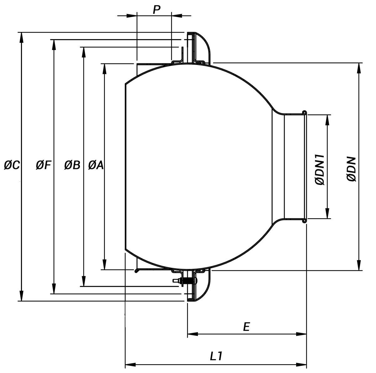 | Modello | Sezione efficace m² | Ø DN | Ø DN1 | Ø A | Ø B | Ø C | Ø F | L1 | E | P |