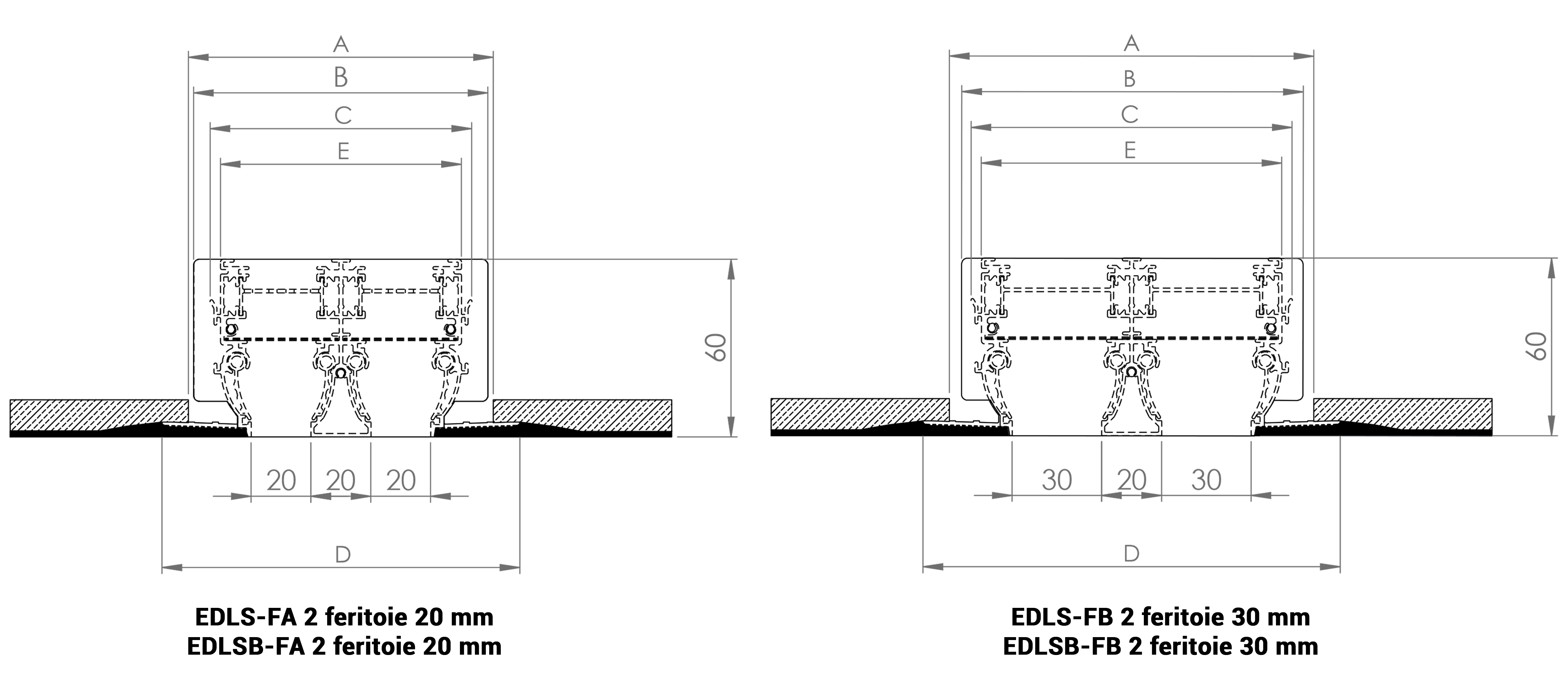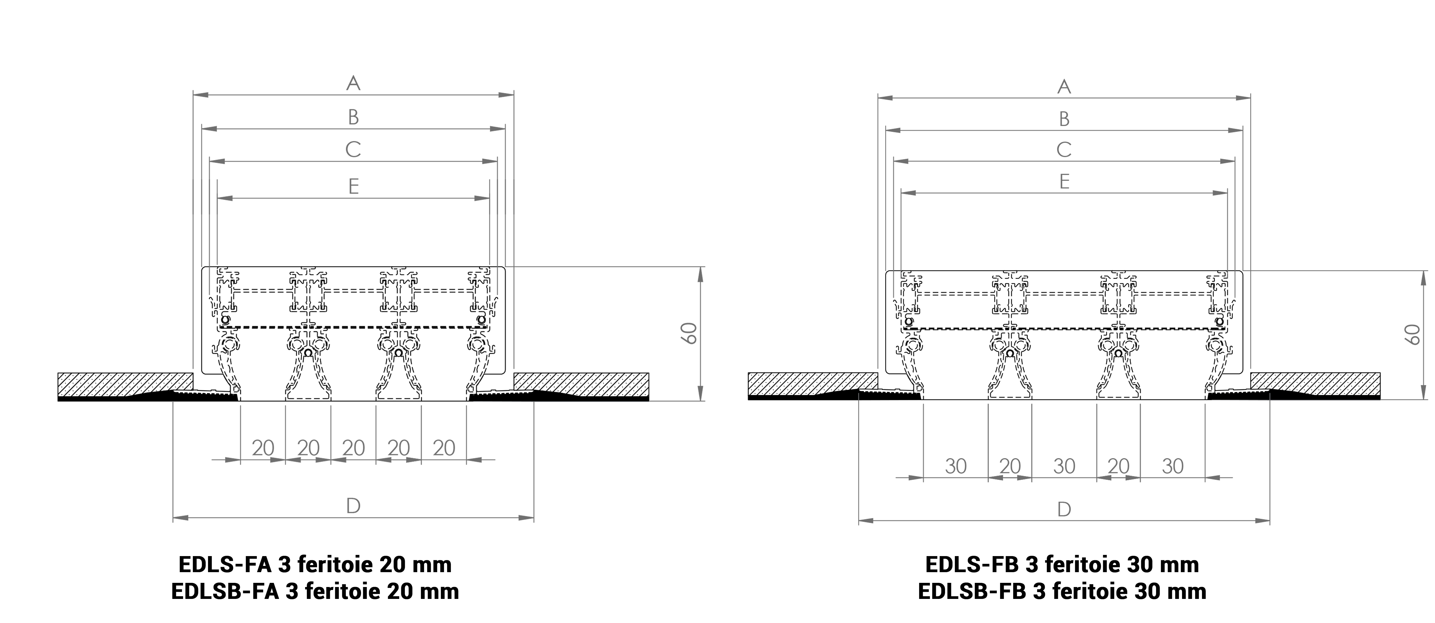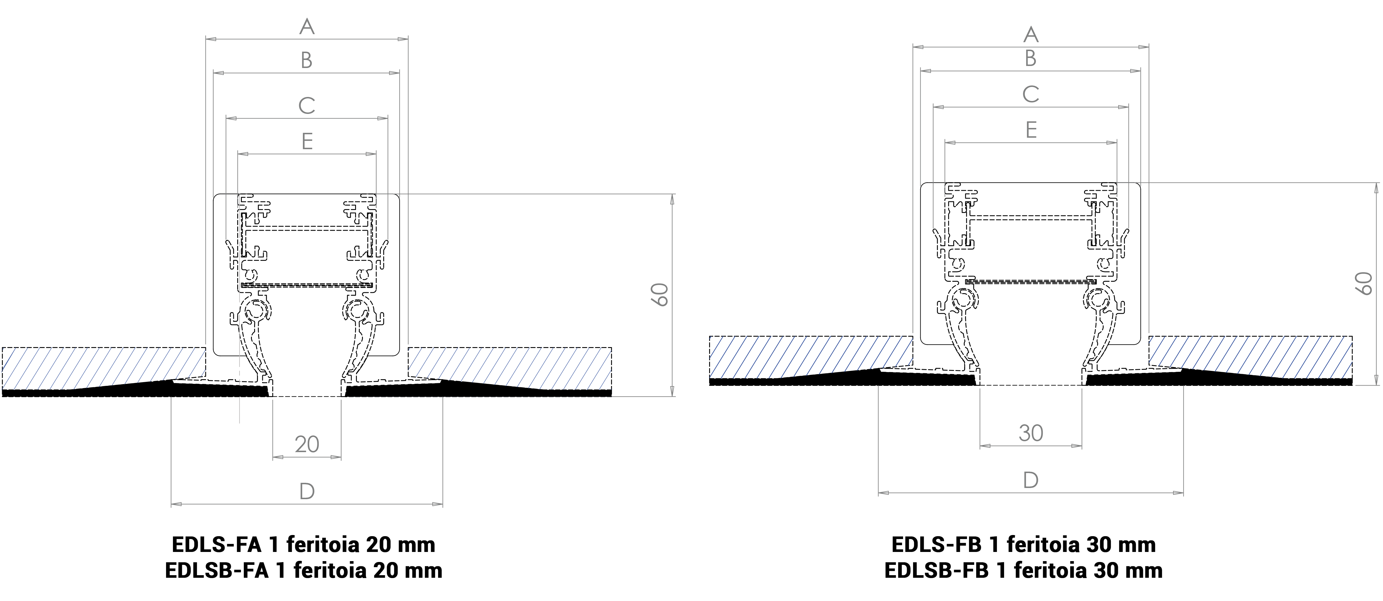 Feritoia L A B C E D Numero Ponti di Fissaggio Feritoia da 20 mm 800 60 55 48 41 80 2 1000 2 1200 2 1500 2 2000 2 Feritoia da 30 mm 800 70 65 58 51 90 2 1000 2 1200 2 1500 2 2000 2
