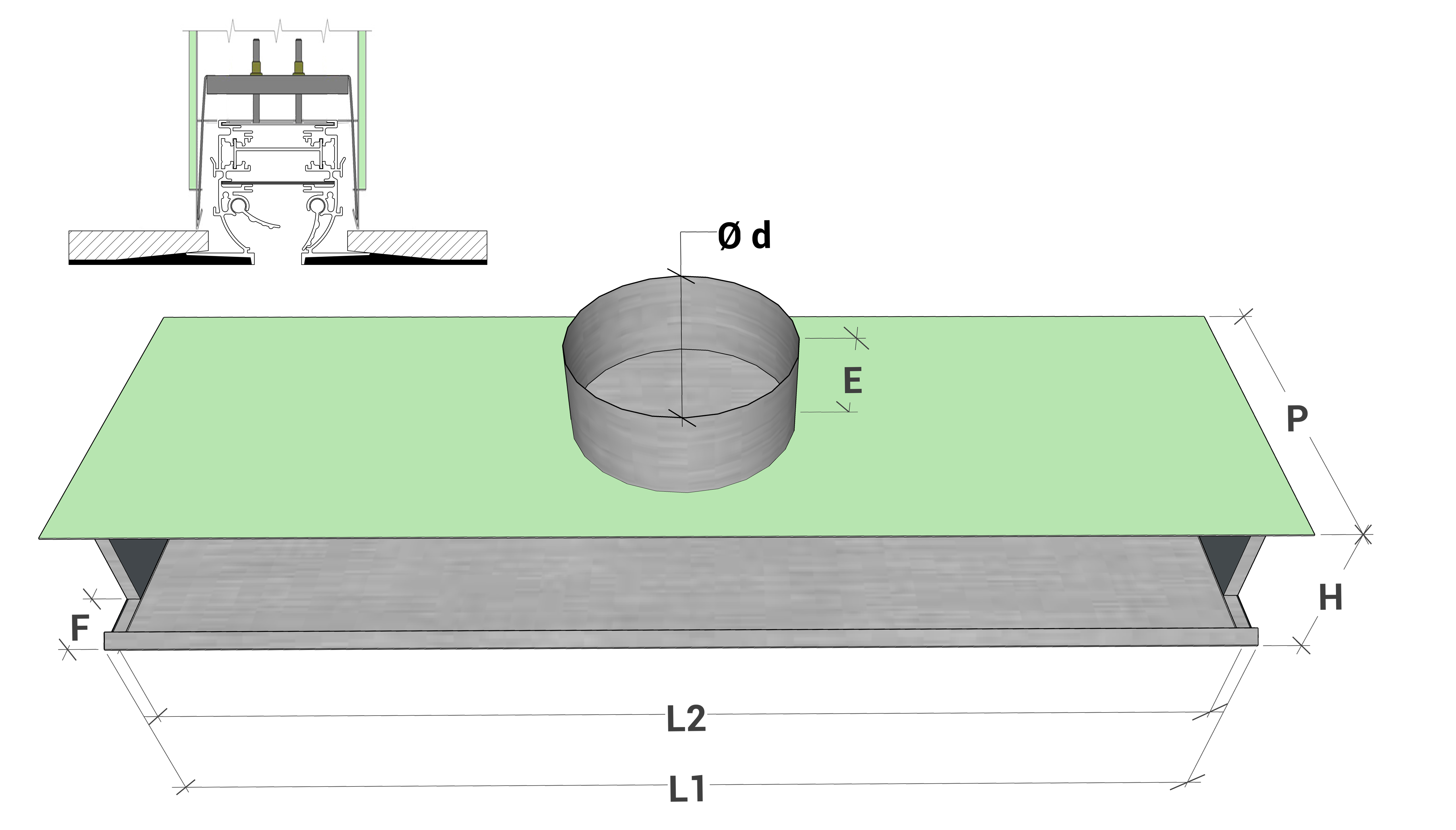 2 FeritoieL Dimensioni Plenum L1 L2 Numero stacchi Ø d P H E F Feritoia da 20 mm 800 800 770 2 145 300 105 80 49 1000 1000 970 2 1200 1200 1170 2 1500 1500 1470 2 2000 2000 1970 2 Feritoia da 30 mm 800 800 770 2 198 300 125 80 49 1000 1000 970 2 1200 1200 1170 2 1500 1500 1470 2 2000 2000 1970 2