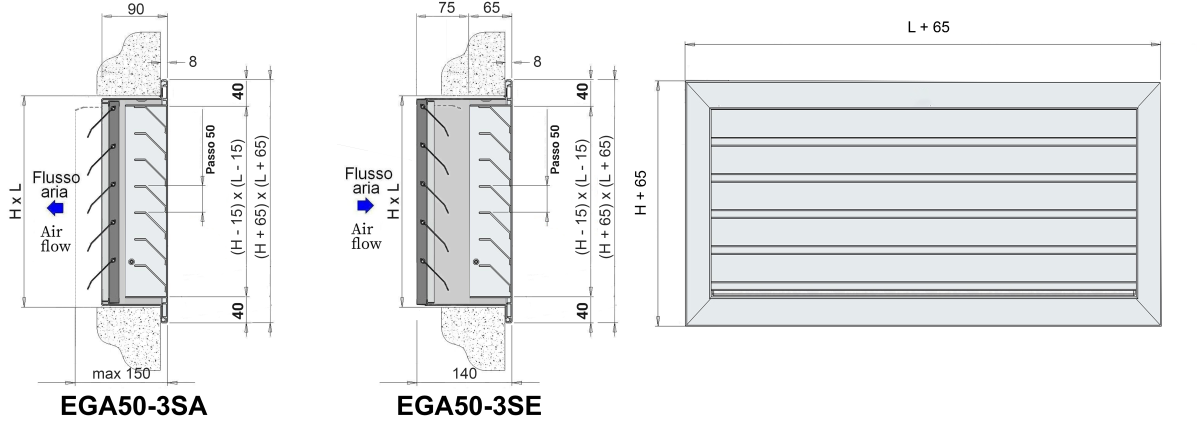 EGA50-3SE: Griglie di espulsione in alluminio passo 50 mm con serranda di sovrapressione.