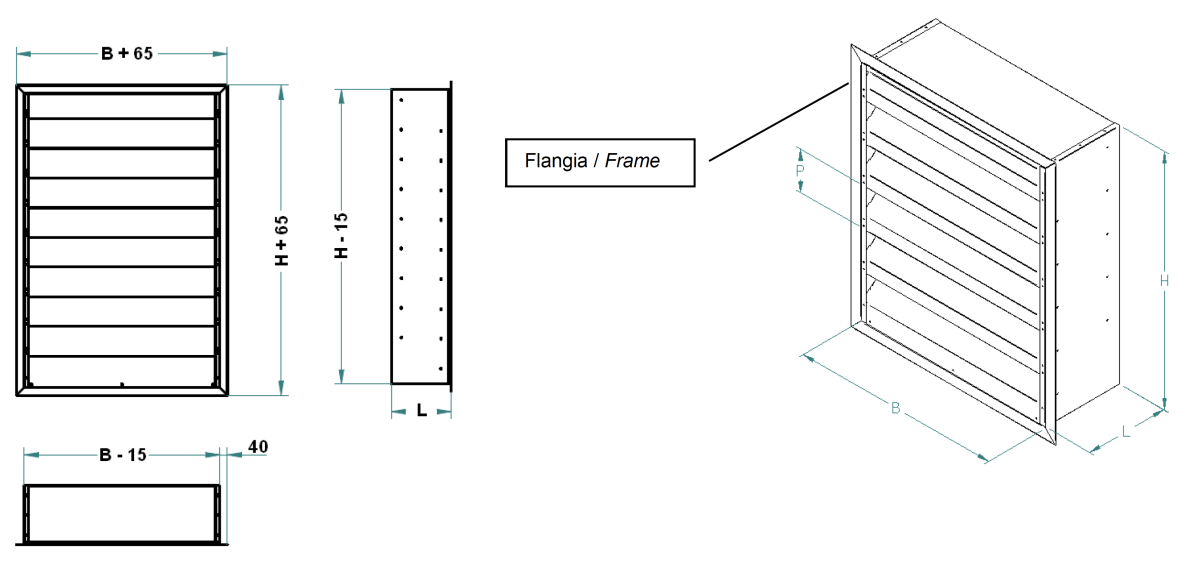 Il telaio è costruito in lamiera d'acciaio zincata, con profondità 300 mm standard. Alette con passo 150 mm in lamiera d’acciaio zincata, sagomate per il contenimento del materiale fonoassorbente. Lato interno rivestito con rete microstirata. Flangia perimetrale da 40 mm in acciaio zincato e rete antivolatile a richiesta.
