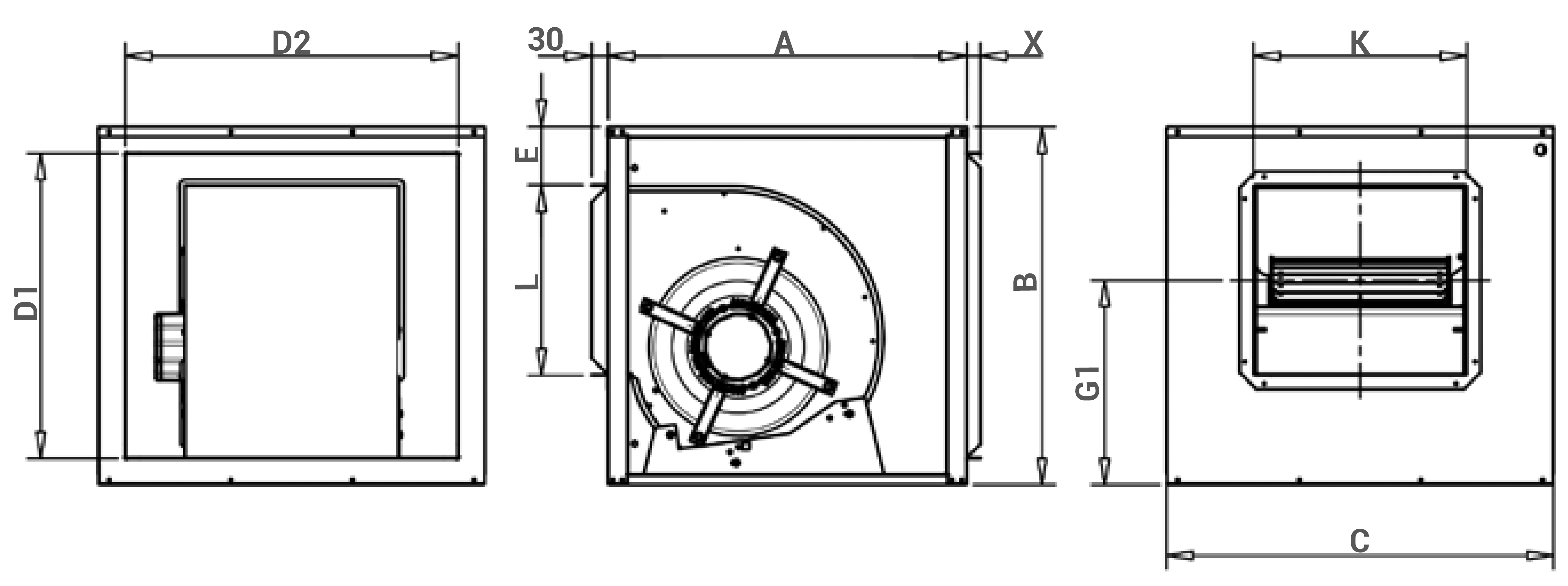 Ventilatore: in acciaio zincato, girante con pale avanti, motore direttamente accoppiato chiuso, protezione termica integrata, classe F e grado di protezione IP54.