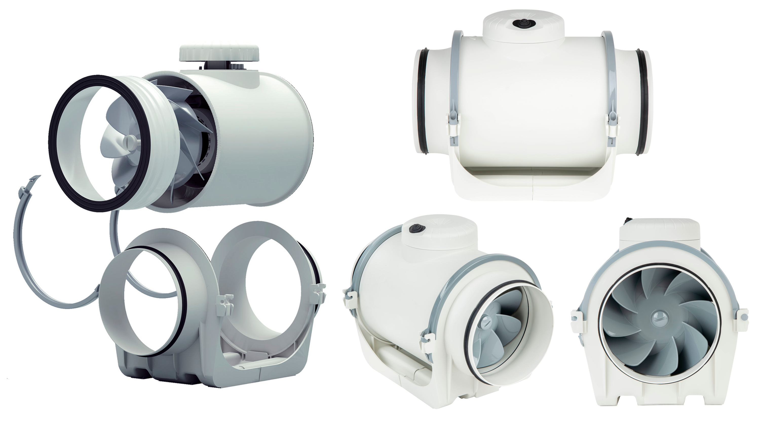 Ventilatore da condotto circolare, con scatola morsettiera esterna, involucro smontabile e motore regolabile, alimentazione 220-240V 50/60Hz.