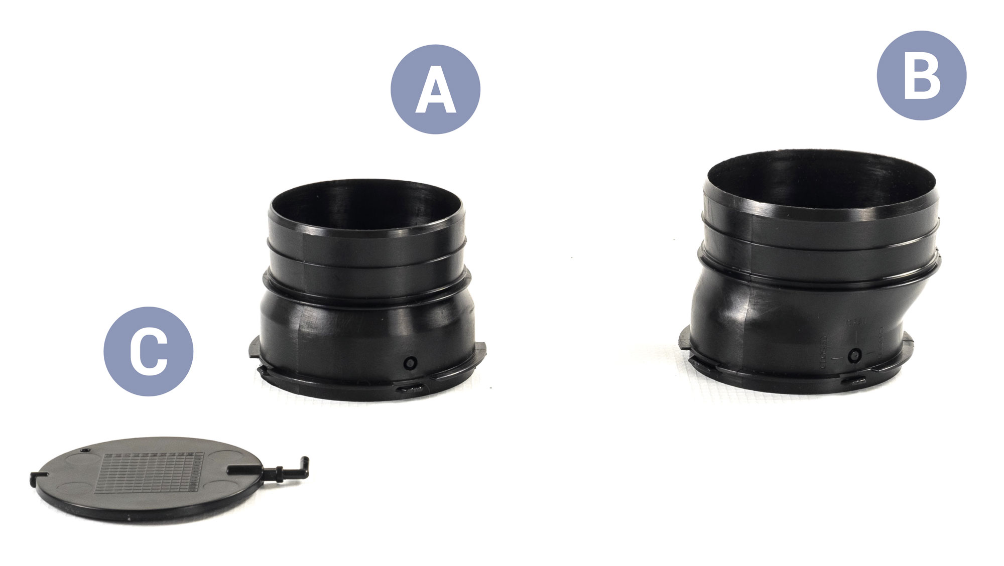 I manicotti per il collegamento al tubo corrugato HTPE PLUS sono realizzati in polipropilene e grazie ad un sistema ad aggancio rapido sono perfettamente intercambiabili tra il diametro 63 mm ( di serie ) e 76 mm
