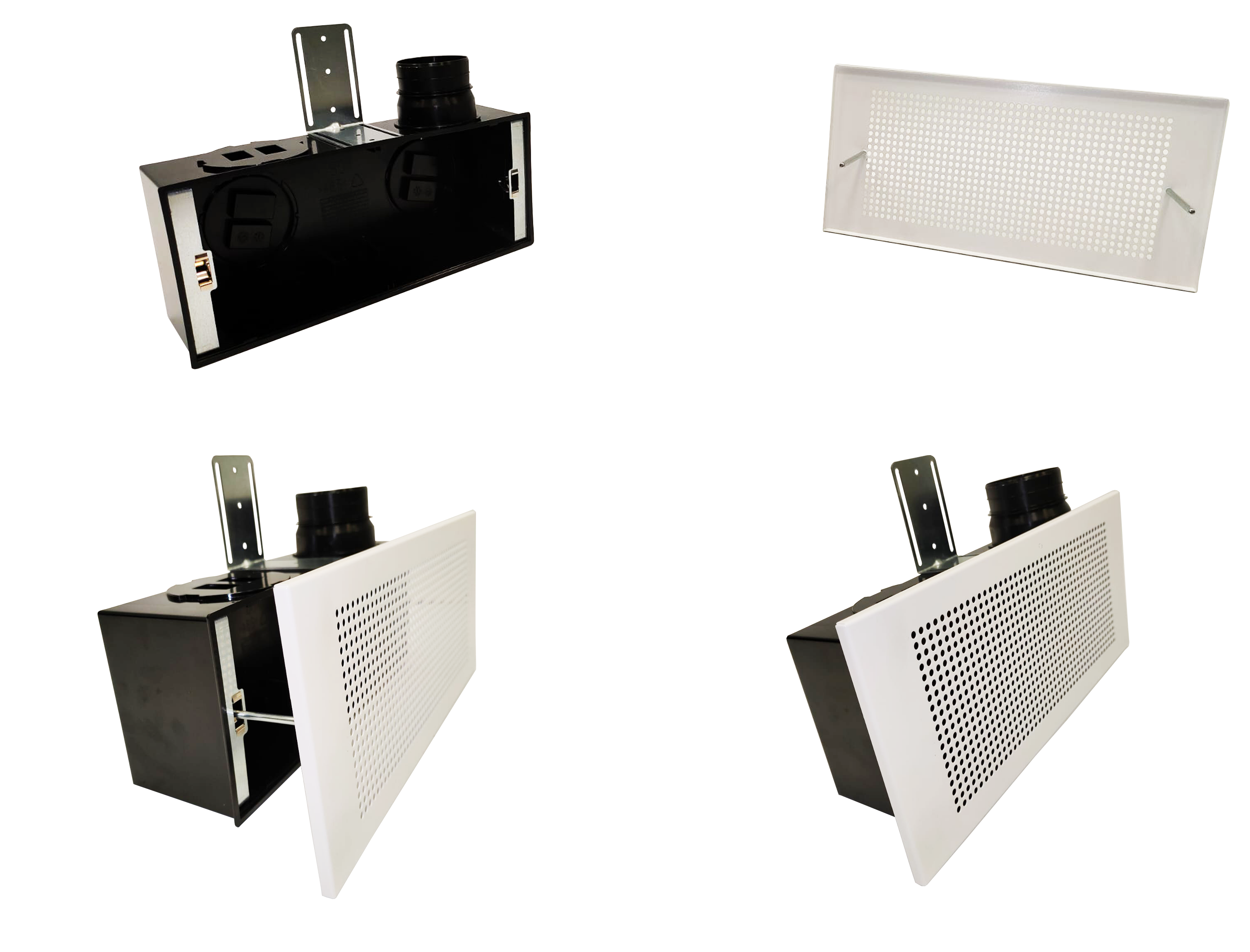 Verniciatura standard RAL9003 opaco con trattamento di superficie per la massima resistenza alla corrosione. Sistema di accoppiamento rapido ad innesto diretto a mezzo di appositi perni in dotazione che permettono escursione variabile da 0 a 30 mm a correzione dell’eventuale disallineamento tra plenum e parete.