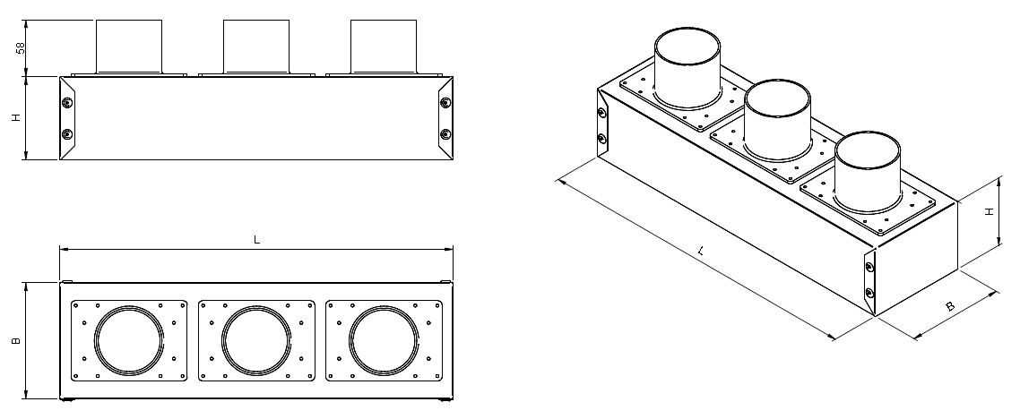 Plenum in robusto acciaio zincato o verniciato nero opaco, con attacchi posteriori in materiale plastico, diametro 63 mm, sagomati per una perfetta tenuta con il tubo HTPE PLUS. Idoneo per griglie EAGF, EAG, EAL.