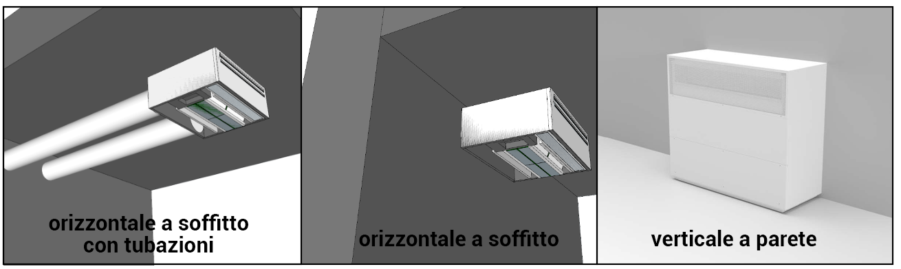 Configurazione ORIZZONTALE: l’unità può essere installata a ridosso della parete con i tubi direttamente verso l’esterno oppure distante dalla parete effettuando un minimo di canalizzazioni per arrivare con le tubazioni verso l’esterno.