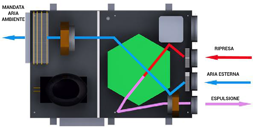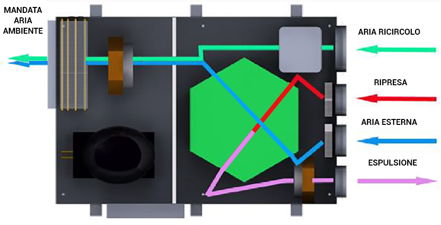 Unità per il rinnovo dell'aria ambiente con quella esterna attraverso un recuperatore ad alta efficienza, la portata d'aria viene aumentata ricircolando parzialmente l'aria ambiente consentendo così di deumidificare l'aria e di fornire un’integrazione della potenza frigorifera/termica all'impianto di climatizzazione radiante.