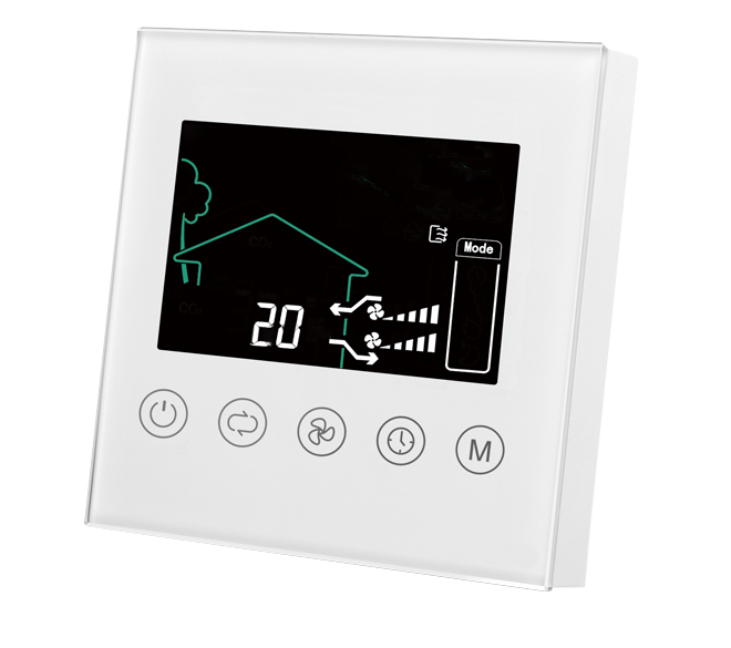 Versione IN2: con scheda elettronica per gestione velocità a 3 gradini, funzione antigelo e bypass automatico. Pannello remoto touch a parete su scatola 503.