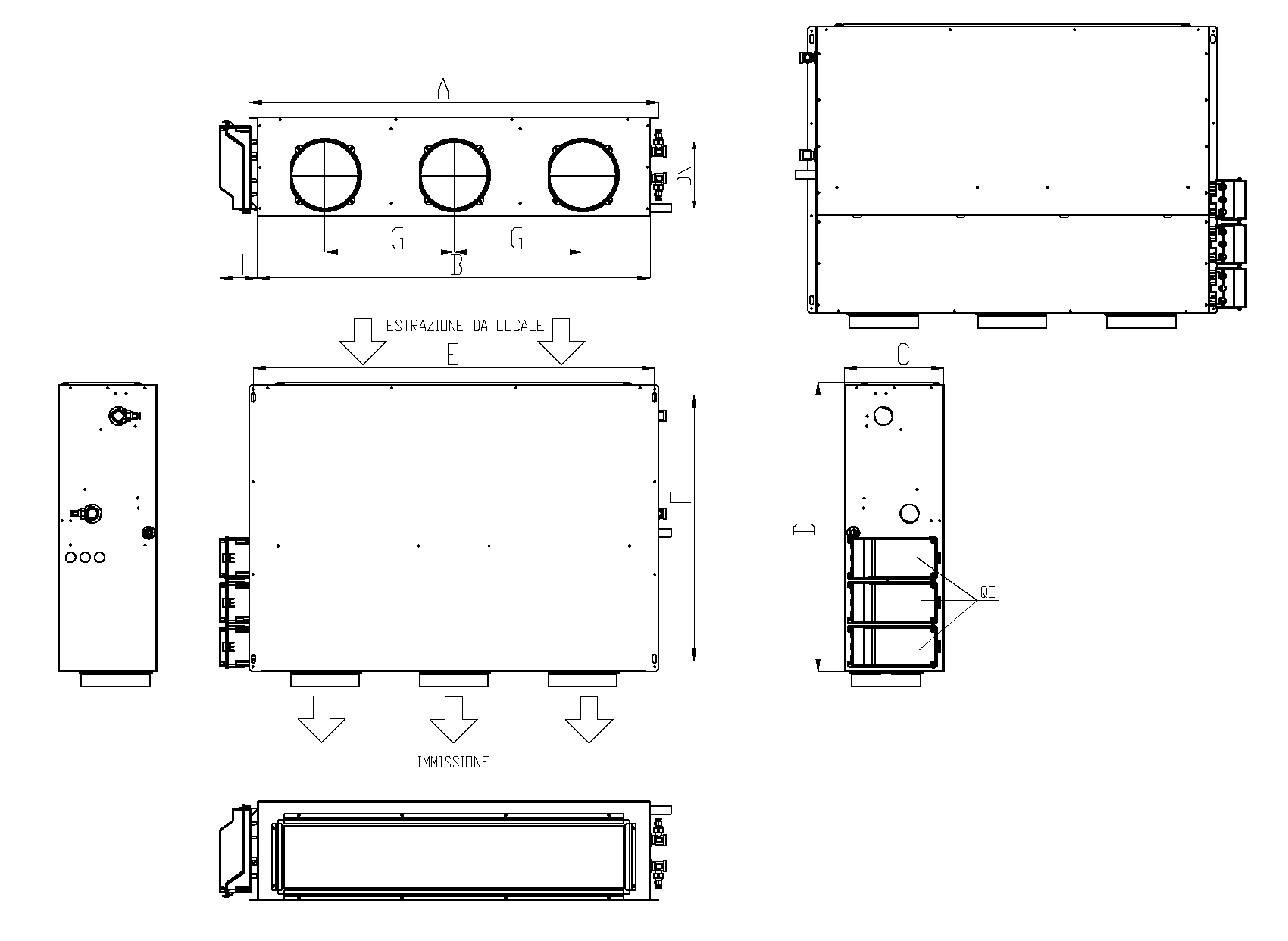 | Modello | A | B | C | D | E | F | H | Ø mandata aria DN | Ripresa aria | Attacchi acqua IN/OUT | Ø Scarico condensa mm | Numero quadri elettrici QE | Peso Kg |