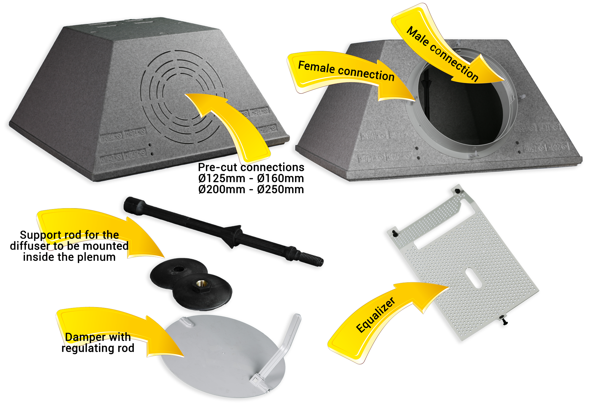 Designed for use with diffusers on panels with nominal dimensions 300x300, 400x400, 500x500 and 600x600. The plenum is supplied without the hose connection.