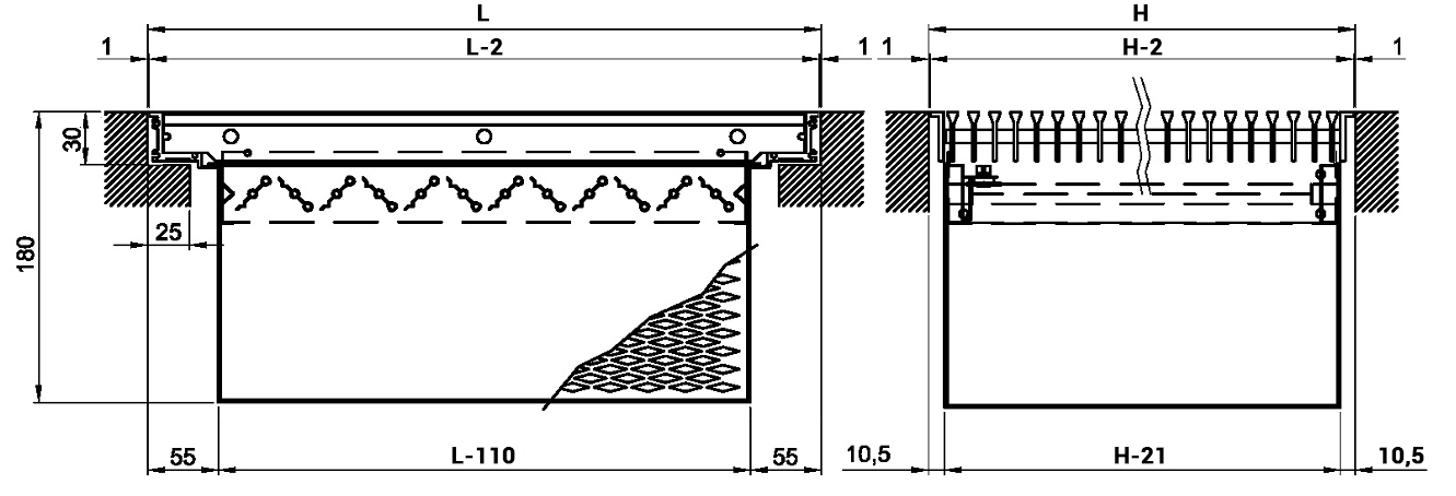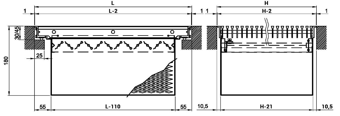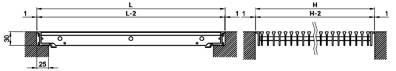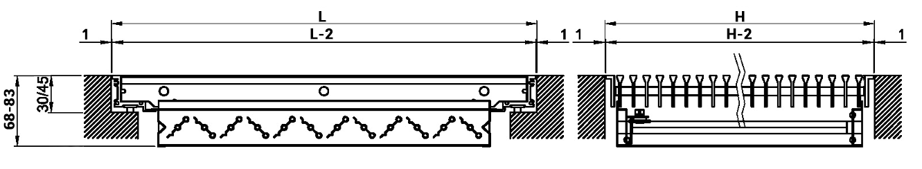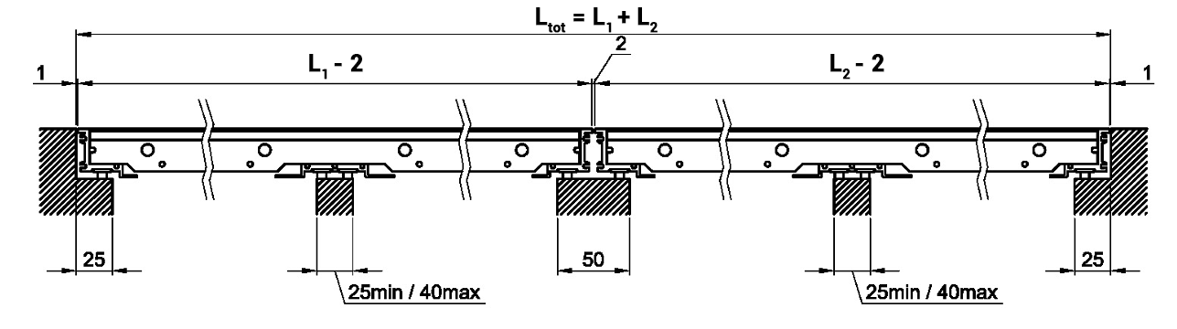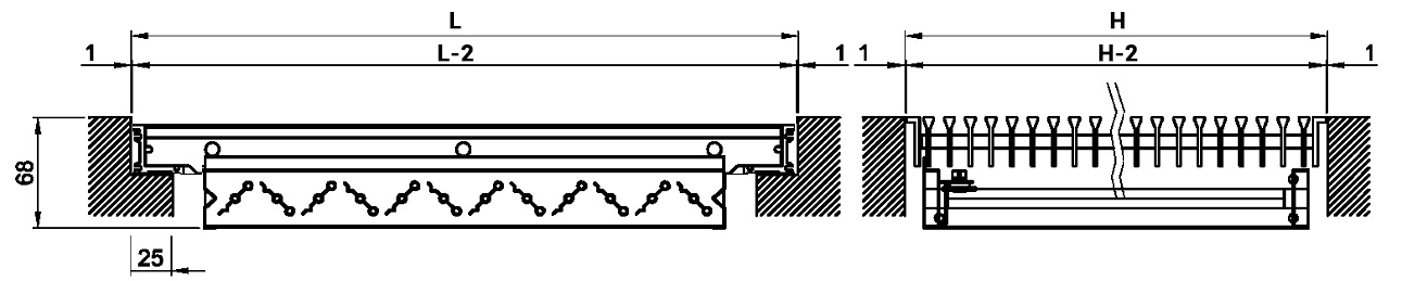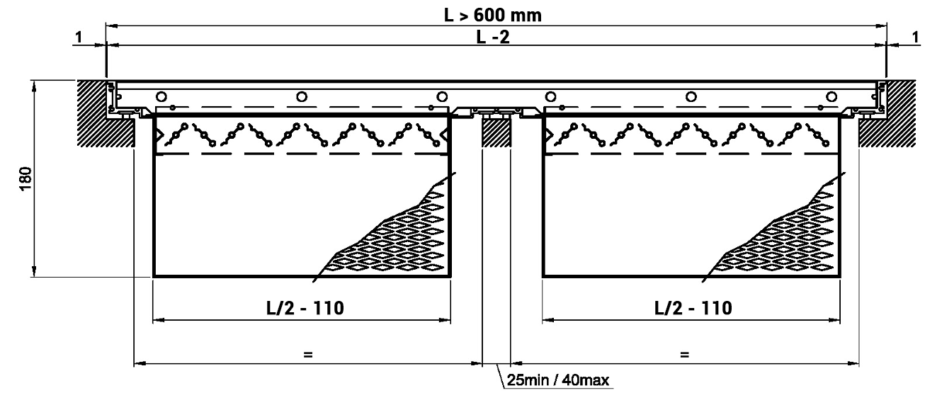 Floor grilles with length L greater than 600 mm are classified according to the EN 13264 Standard only if complete with frame and installation with intermediate support with a maximum width of 40 mm.