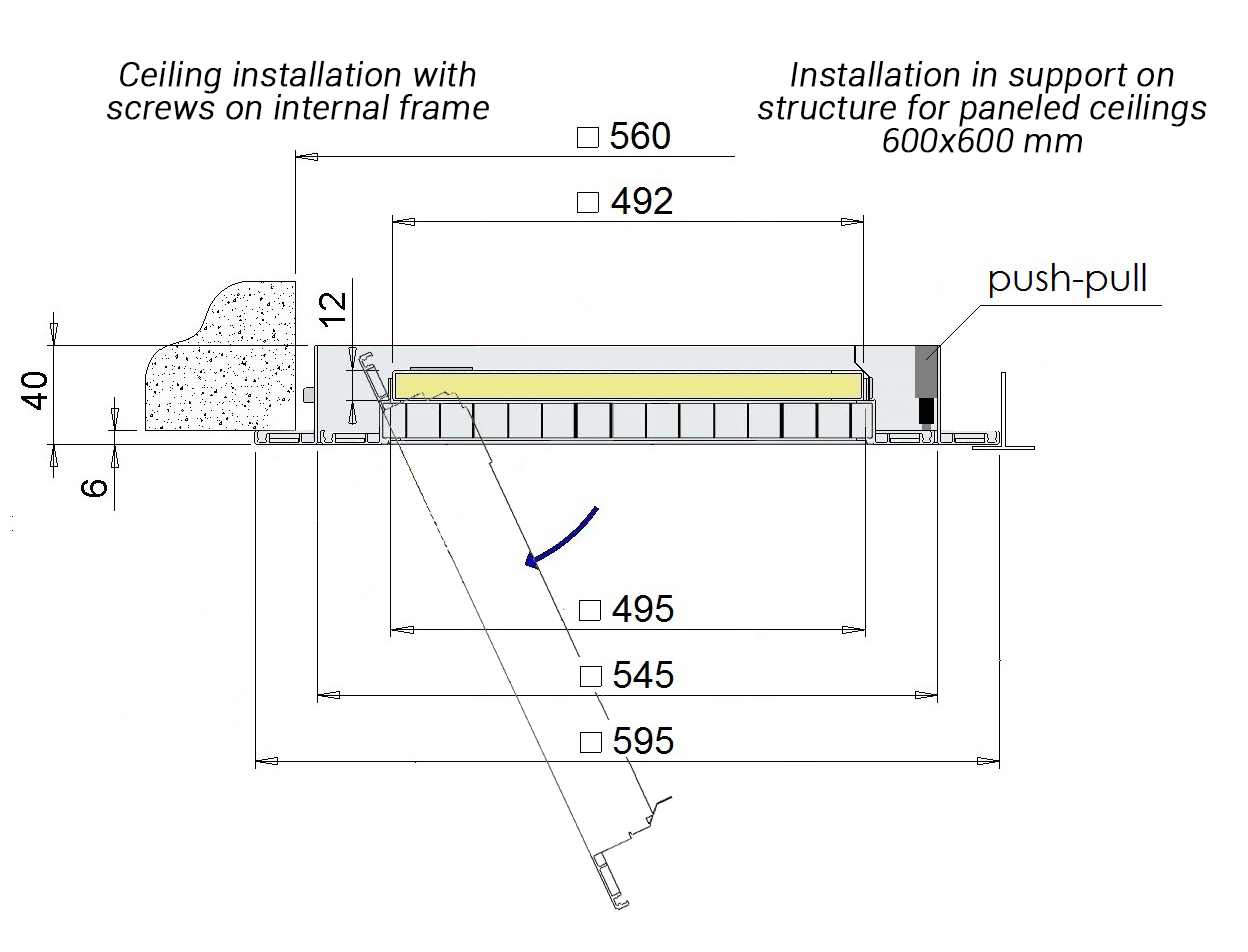 Installation is carried out by securing the external frame of the grille to the wall using screws or, for installation on modular 600x600 false ceilings, resting on the metal structure in place of the panel.