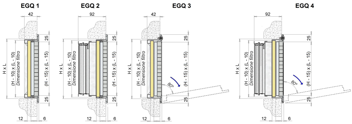 - EGQ4: grille with damper and special counter-frame secured with a hinge to the frame to allow for 80° opening for easy filter maintenance.