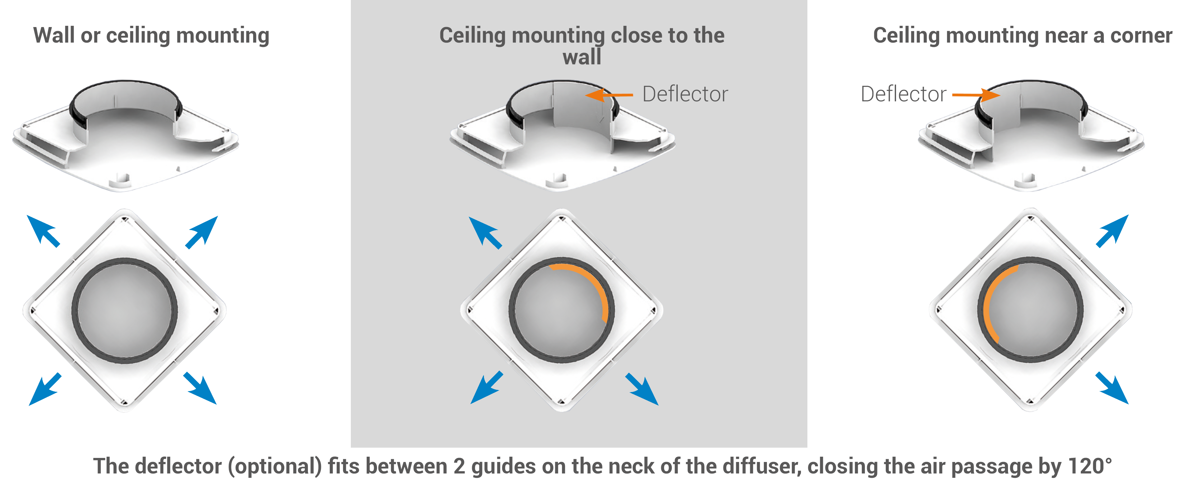In the body of the diffuser it is possible to mount from 1 to 3 EVREA-DF deflectors (optional to be purchased separately) to convey the air in a throw from 1 to 3 ways.