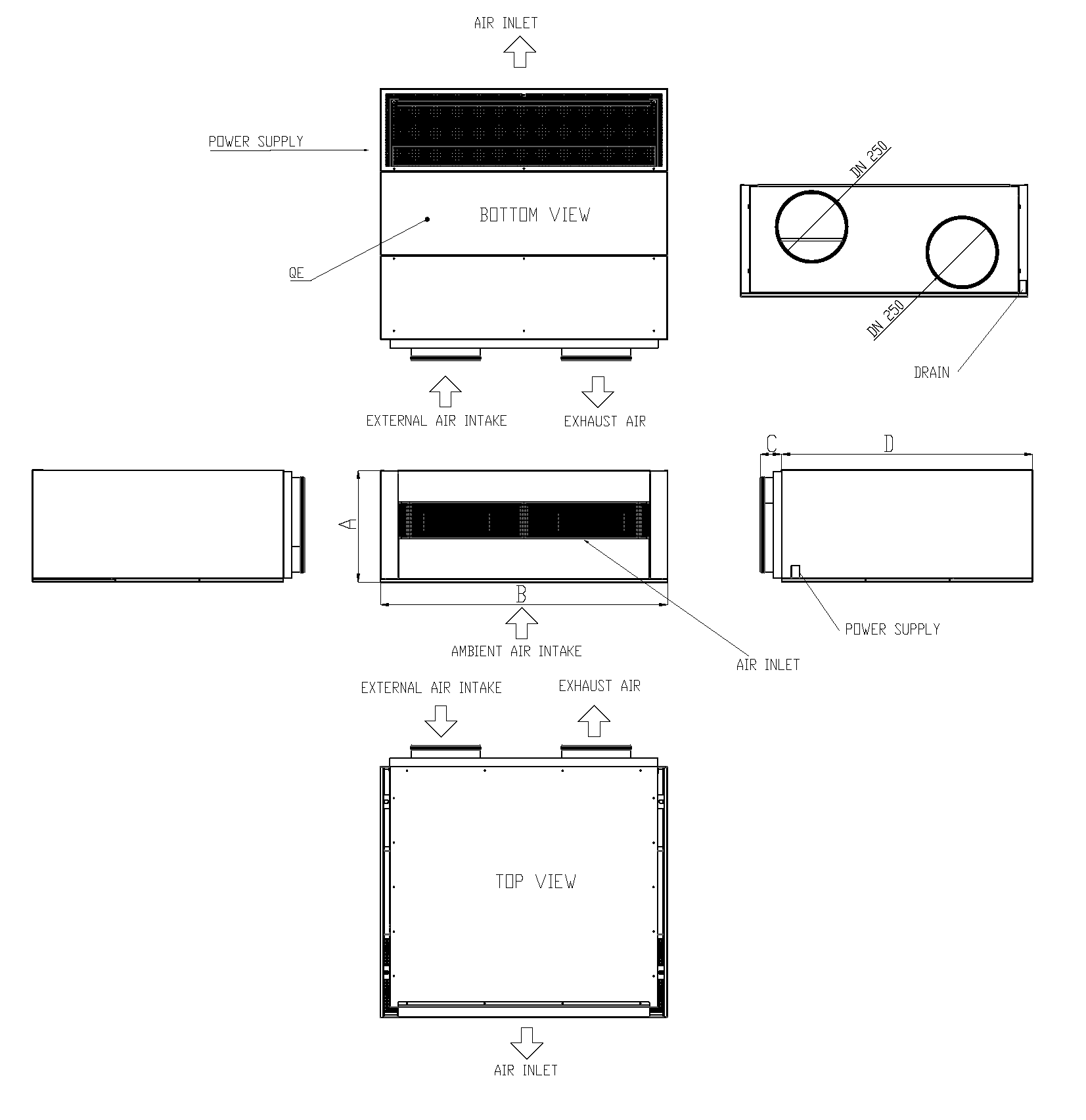 Dimensions – Vertical Configuration 60 V 120 V Height A mm 905 905 Width B mm 1040 1440 Pipe Connection Collars C mm 76 76 Depht D mm 405 405 Connection Diameter mm 200 250 Condensate Drain mm 20 20 Weight Kg 71 88