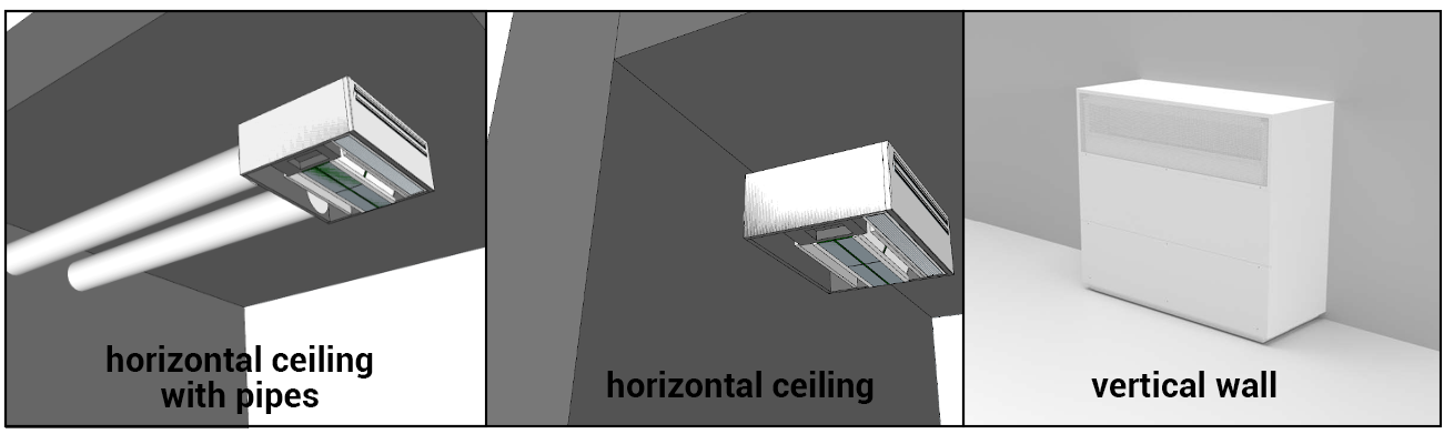 Horizontal configuration: the unit can be installed close to the wall with the ducts pointing directly outwards or away from the wall with minimum ducting to reach the outside.