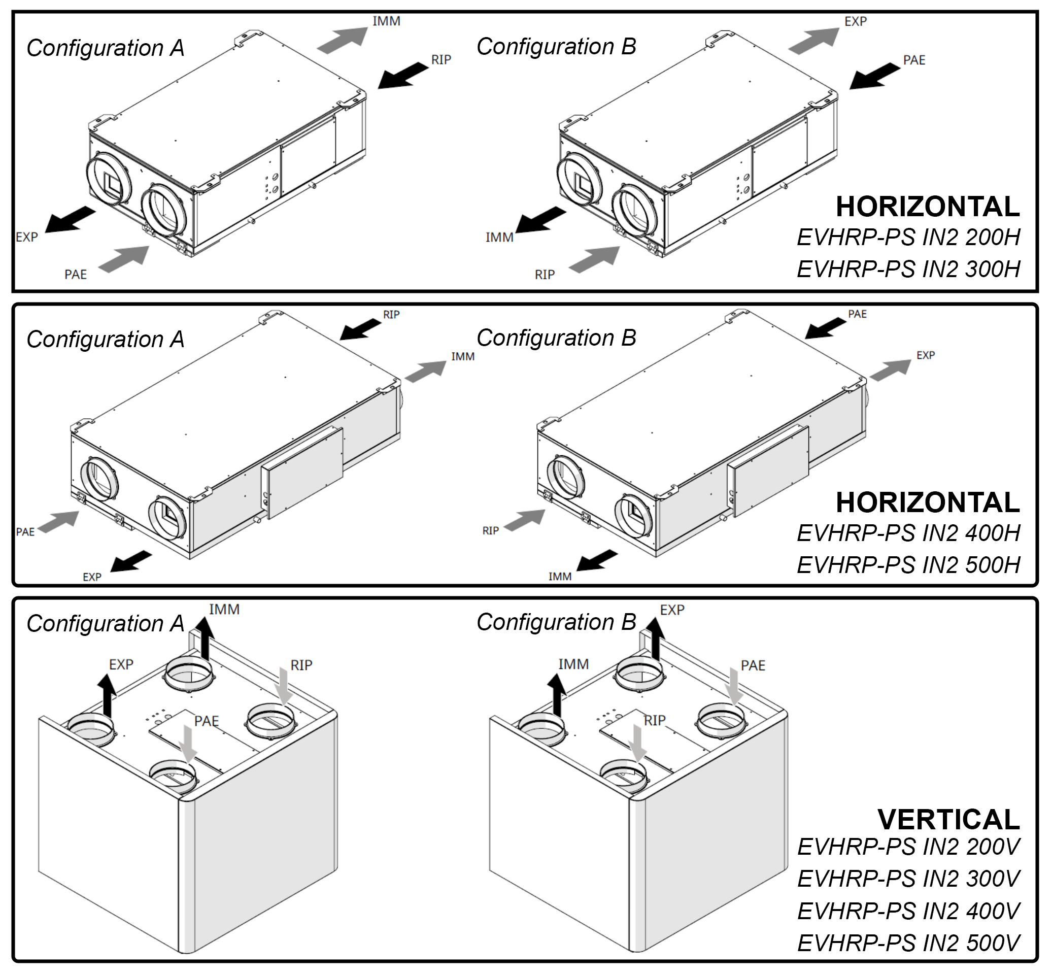 Size EVHRP-PS 200 H 200 V 300 H 300 V 400 H 400 V 500 H 500 V Fan Type Backward-Curved Centrifugal Fans – Directly Coupled Electronic Motor – 0–10 V Signal Nr. Funs Nr. 2 Airflow m³/h 155 160 300 300 340 380 455 450 Available Pressure Pa 100 100 100 100 100 100 100 100 Heat Exchanger (Data according to UNI EN 13141-7: Indoor Temp. 20°C – Indoor Humidity 28% – Outdoor Temp. 7°C – Outdoor Humidity 72%) Recovery efficiency Ounterflow Plates – Polypropylene Material Number of Heat Exchangers Nr. 1 Heat recovery efficiency % 86,0 86,0 85,0 86,0 89,0 87,0 88,0 86,0 Filters Tipo di Filters Filters Planes Filtration class ePM1 70-80% Acoustic data (Data according to UNI EN 3741 and UNI EN 3744) Sound Pressure at 3 m dB(A) 35,0 34,0 37,0 36,0 39,0 38,0 43,0 40,0 Electrical data Power Supply V / ph / Hz 230 / 1 / 50 Current Draw A 0,7 0,7 1,6 1,6 1,6 1,6 2,5 2,5 Power Input W 110 110 180 180 350 350 420 420 Protection Rating IP X2 Dimensions Width mm 487 630 590 787 709 787 709 787 Lenght mm 793 - 789 - 1147 - 1147 - Depht mm - 475 - 619 - 749 - 749 Height mm 258 570 304 670 289 670 289 670 Weight kg 26,0 32,0 31,0 38,0 39,0 42,0 40,0 43,0 Connection Diameter mm 160 160 160 160 160 160 160 160 Condensate Drain mm 12 20 12 20 12 20 12 20 Model classification according to European Regulation 1253/2014 and 1254/2014 With EVCNV2 – EVCNW2 Remote Control (RH / VOC – CO₂) - A A A A A A A A