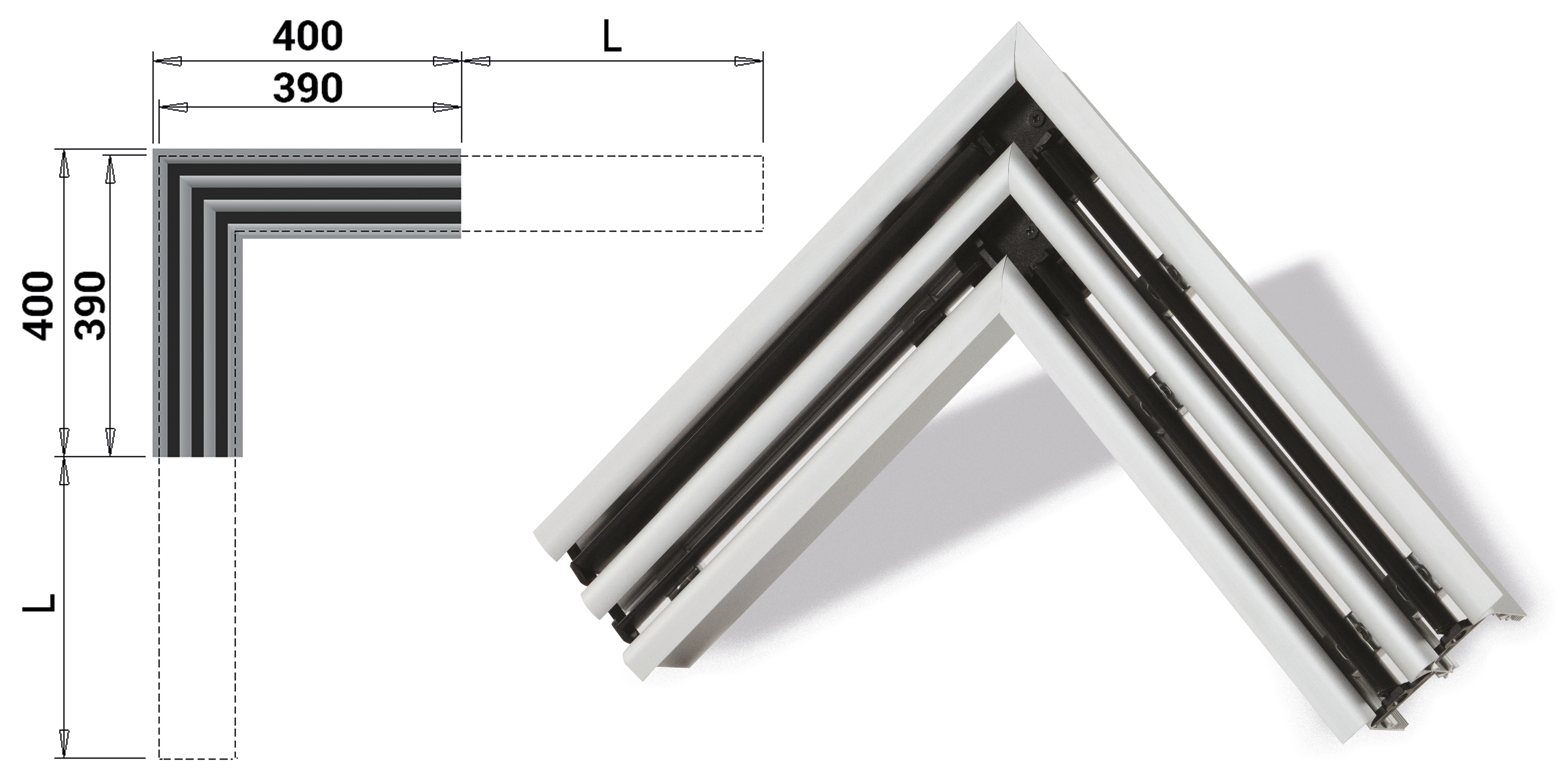 Elemento estetico di raccordo tra i due linee di diffusori lineari con angolo di 90° e lunghezza 400 mm per lato.