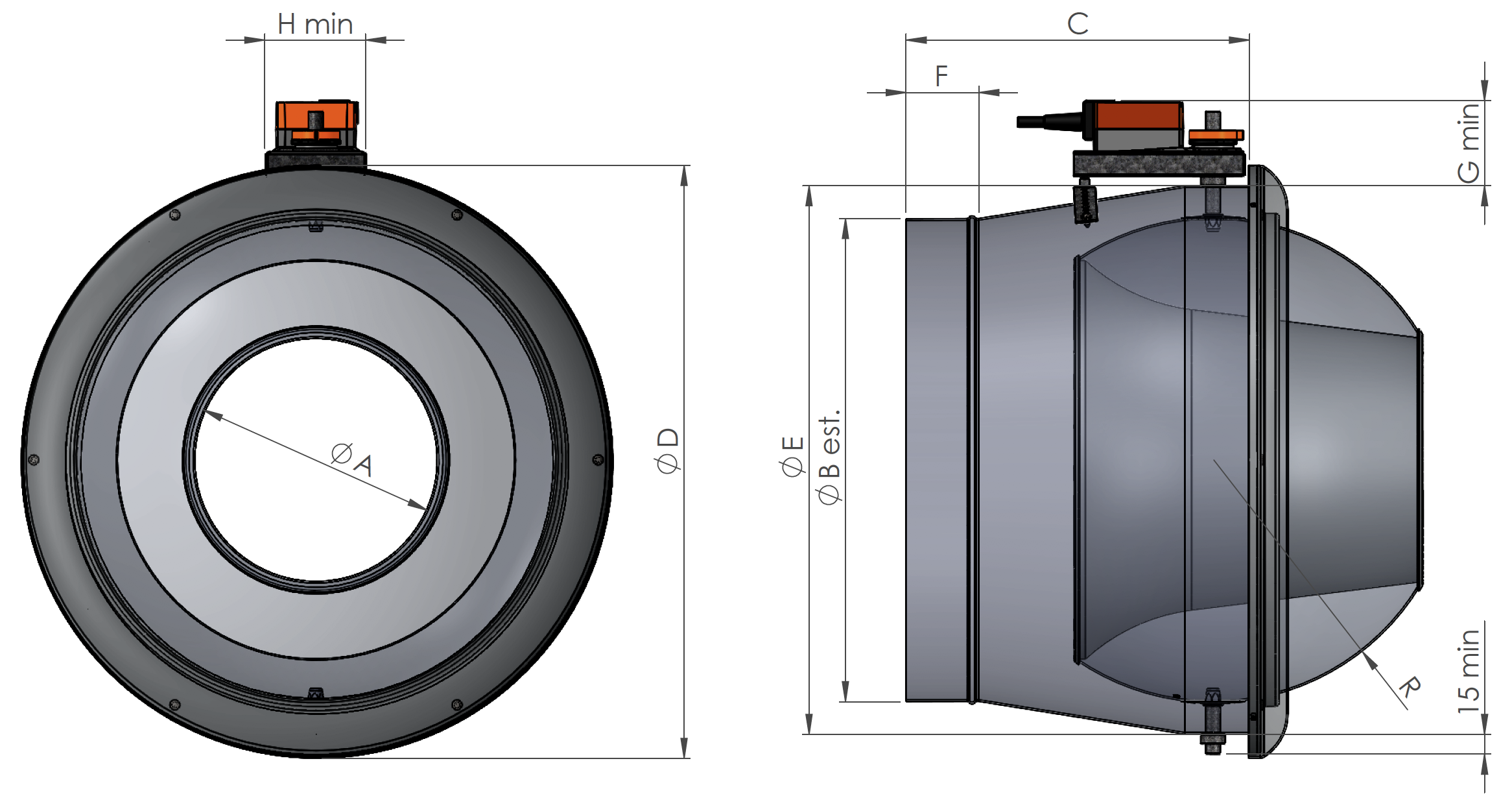 | Dn | A | B | C | D* | E | F | G min | H min | MOT. ON / OFF | Motore Modulante |