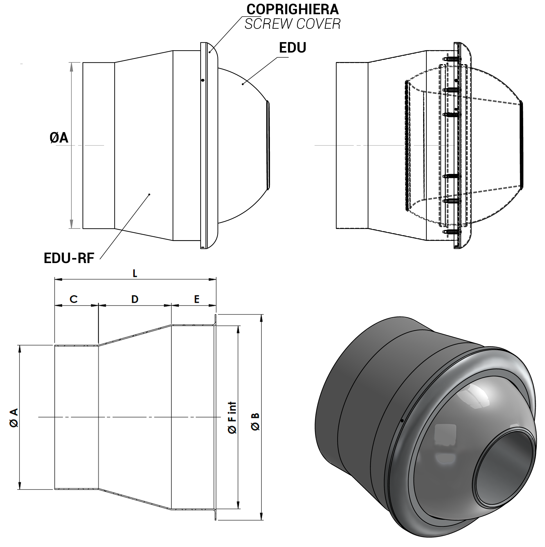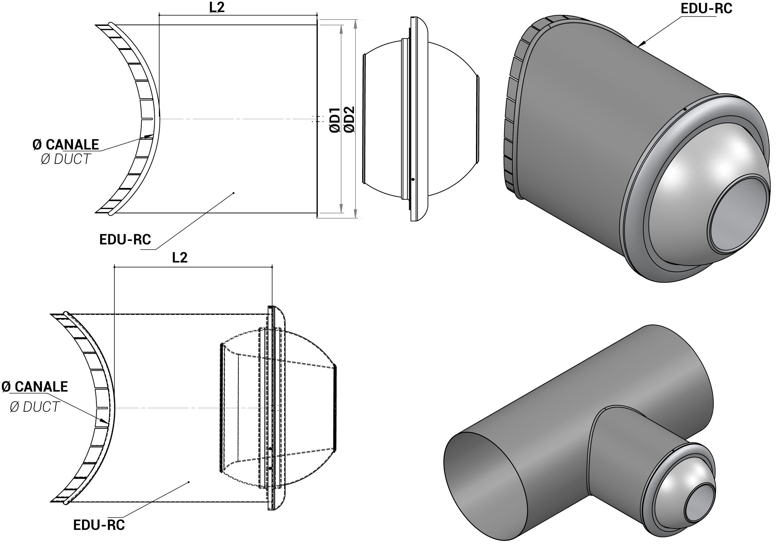 Modello L2 Ø D1 Ø D2 Canale min max EDU-RC 40 150 113 129 160 450 EDU-RC 50 150 138 158 200 500 EDU-RC 80 200 210 230 315 630 EDU-RC 110 300 256 276 315 800 EDU-RC 150 300 358 378 500 800 EDU-RC 200 350 460 480 500 1000 EDU-RC 230 350 460 480 500 1000